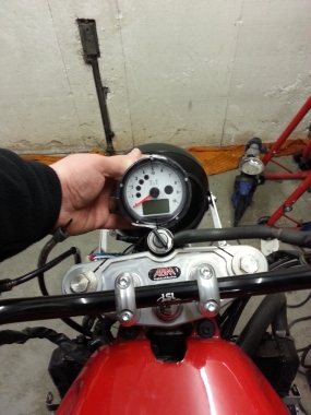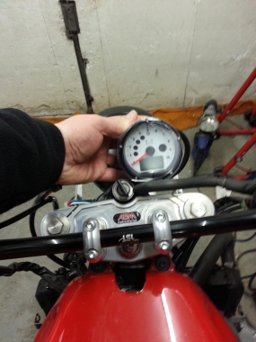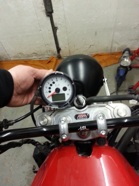 Nachdem ich an dem Versuch, die originalen Instrumente wieder zu integrieren gescheitert bin (ich schätze, zu wenig Fanzasie...), bin ich einen leichteren Weg gegangen und habe einen Tacho aus dem Zubehör besorgt.