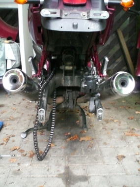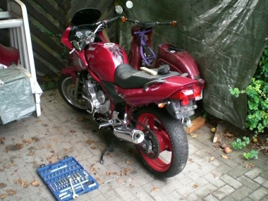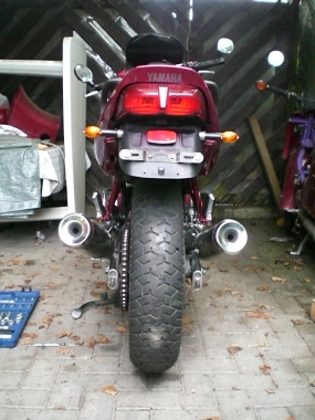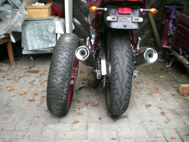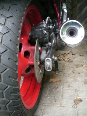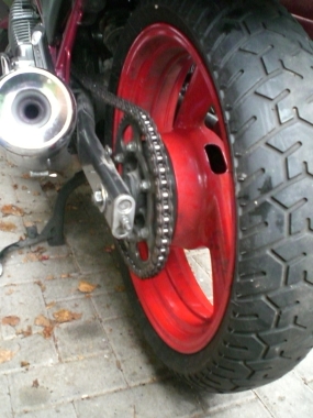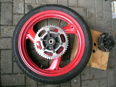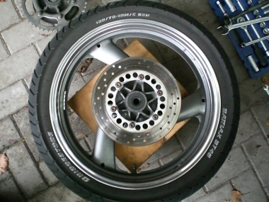Hierzu benötigt man eine breitere Felge. Zufällig passt die Felge der Yamaha FZR 600 (Typ 3HE; Baujahre 1989-90) genau in die Schwinge der Diversion und das Beste ist: OHNE JEDE ÄNDERUNG ![]()